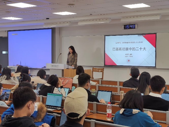 学习会的第二个环节:“与世界对话:国际社会与二十大”,邀请了来自四个不同语种专业的五位党员、预备党员分享对象国与二十大的故事。朝鲜语专业雷文聪以中国驻韩大使馆的视角切入,从使馆开展的活动、宣传及大使发言等方面介绍二十大精神在韩国的传播情况,展现了二十大精神在韩国各界引发的热烈反响,再现了两国增信释疑的全过程;乌尔都语专业郭欣雨、刘辰煜呈现了巴基斯坦人眼中的二十大,中巴友谊历经几十年风雨洗礼,愈加历久弥新,巴基斯坦政要及学界都对二十大取得的丰硕成果表达了高度赞扬,并传达了继续加强合作、深化友谊的期盼;印地语专业吴尚着重介绍了中国驻印度大使馆及领馆在宣传二十大精神上所取得的成绩,并以中印关系为中心,探讨了两国面对的机遇及挑战,强调了求同存异、共同发展的重要性,生动展现了二十大精神在国际传播中的真实图景;斯瓦希里语专业于明弘从舆论宣传的角度介绍了肯尼亚、坦桑尼亚及卢旺达三国主流媒体对二十大会议的相关报道,三国各主流媒体分别从政治、经济、外交及民生等不同领域出发,结合本国实际情况对二十大会议成果做出了高度评价,并就如何化用中国经验、中国智慧促进本国发展进行了详细探讨,也引发了现场同学们的思考。