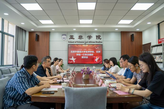 2023年6月9日上午,调研团前往西安外国语大学亚非学院开展调研。双方就院系设置及专业开设情况、专业发展所获得的政策支持或专项经费支持、本、硕、博层次人才培养模式改革重点、开展有组织科研情况及开展国别区域研究特色做法、与国外高校合作情况及学生赴对象国留学情况、就业特色及近三年就业情况以及学院心理健康教育模式等内容进行了深入交流。西安外国语大学亚非学院党委书记蓟光辉、党委副书记李佳、副院长陈泽华及部分亚非学院青年教师参与此次座谈会。