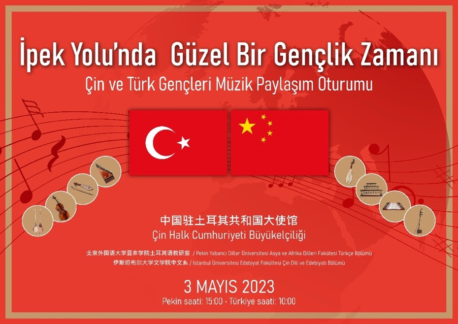 为庆祝“一带一路”倡议提出十周年,落实习近平总书记提出的全球文明倡议,在五四青年节前夕,中国驻土耳其大使馆举办丝路韶华—中土青年音乐分享会,北外新葡8883官网AMG官网土耳其语专业师生同土耳其伊斯坦布尔大学中文系师生代表共同参加此次线上交流活动。