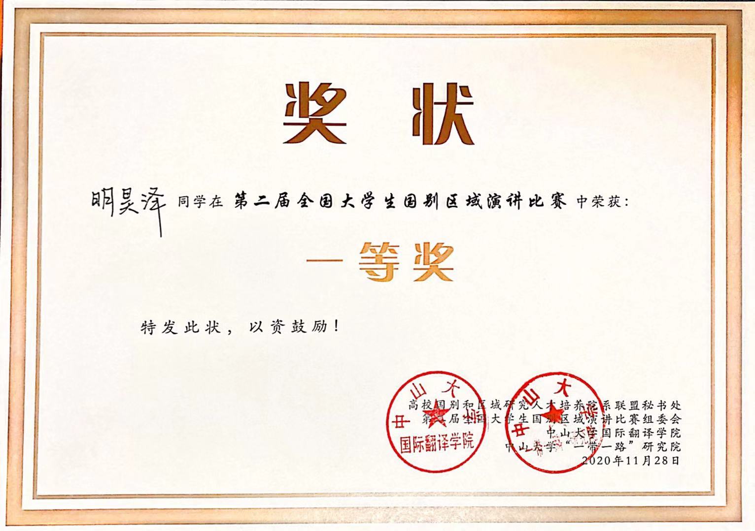 11月28日,第二届全国大学生国别区域演讲比赛在珠海举行。新葡8883官网AMG官网柬埔寨语专业2019级本科生明昊泽荣获一等奖。