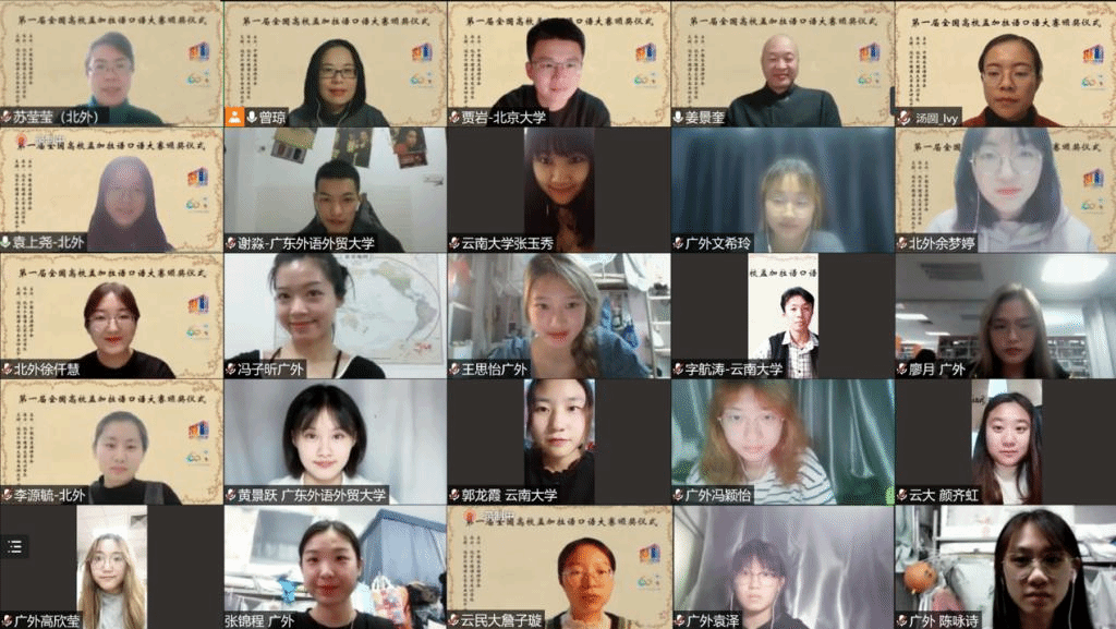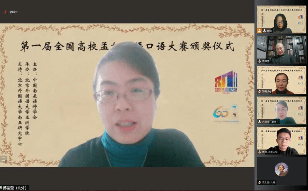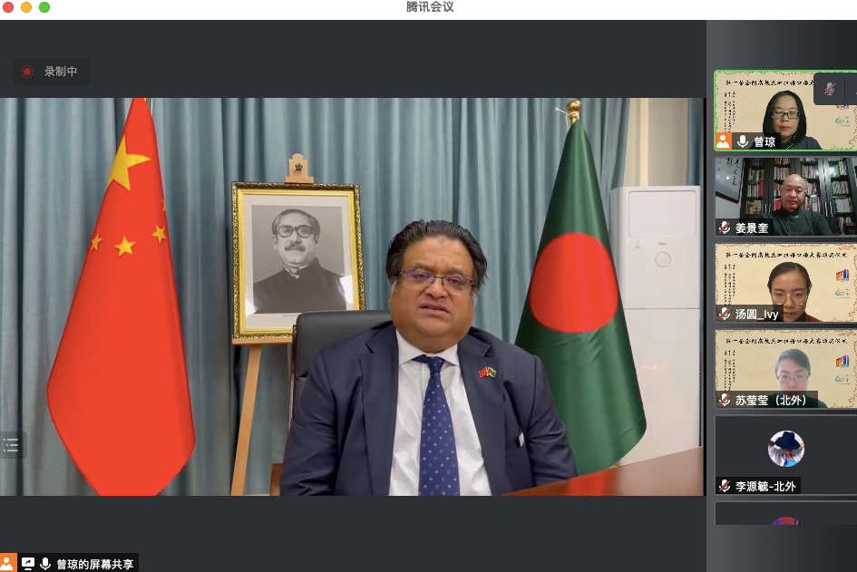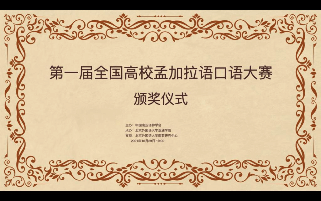 2021年10月29日晚,“第一届全国高校孟加拉语专业口语大赛”颁奖仪式以线上形式举行。孟加拉国驻华大使为发来祝贺视频,中国南亚语种学会会长、教育部高校外指委副主任委员、非通用语分指委主任委员、北京大学南亚研究中心主任姜景奎教授,新葡8883官网AMG官网院长苏莹莹教授出席仪式并致辞,中央广播电视总台孟加拉语部于广悦主任发来贺词。出席颁奖仪式的还有中国南亚语种学会秘书长、北京大学外国语学院助理教授贾岩博士,新葡8883官网AMG官网、广东外语外贸大学、云南民族大学、云南大学孟加拉语专业师生共计50余人。颁奖仪式由新葡8883官网AMG官网孟加拉语教研室主任曾琼教授主持。