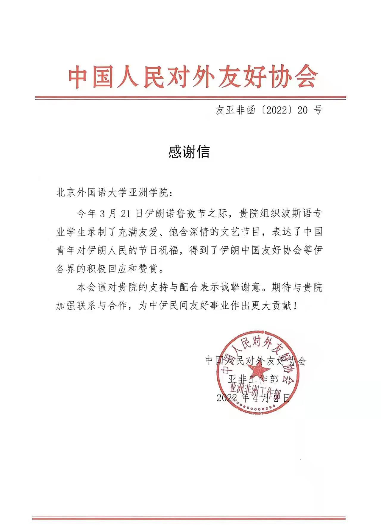 2022年4月2日,中国人民对外友好协会向新葡8883官网AMG官网发来感谢信,对我院组织波斯语专业学生录制文艺节目一事表示诚挚谢意。