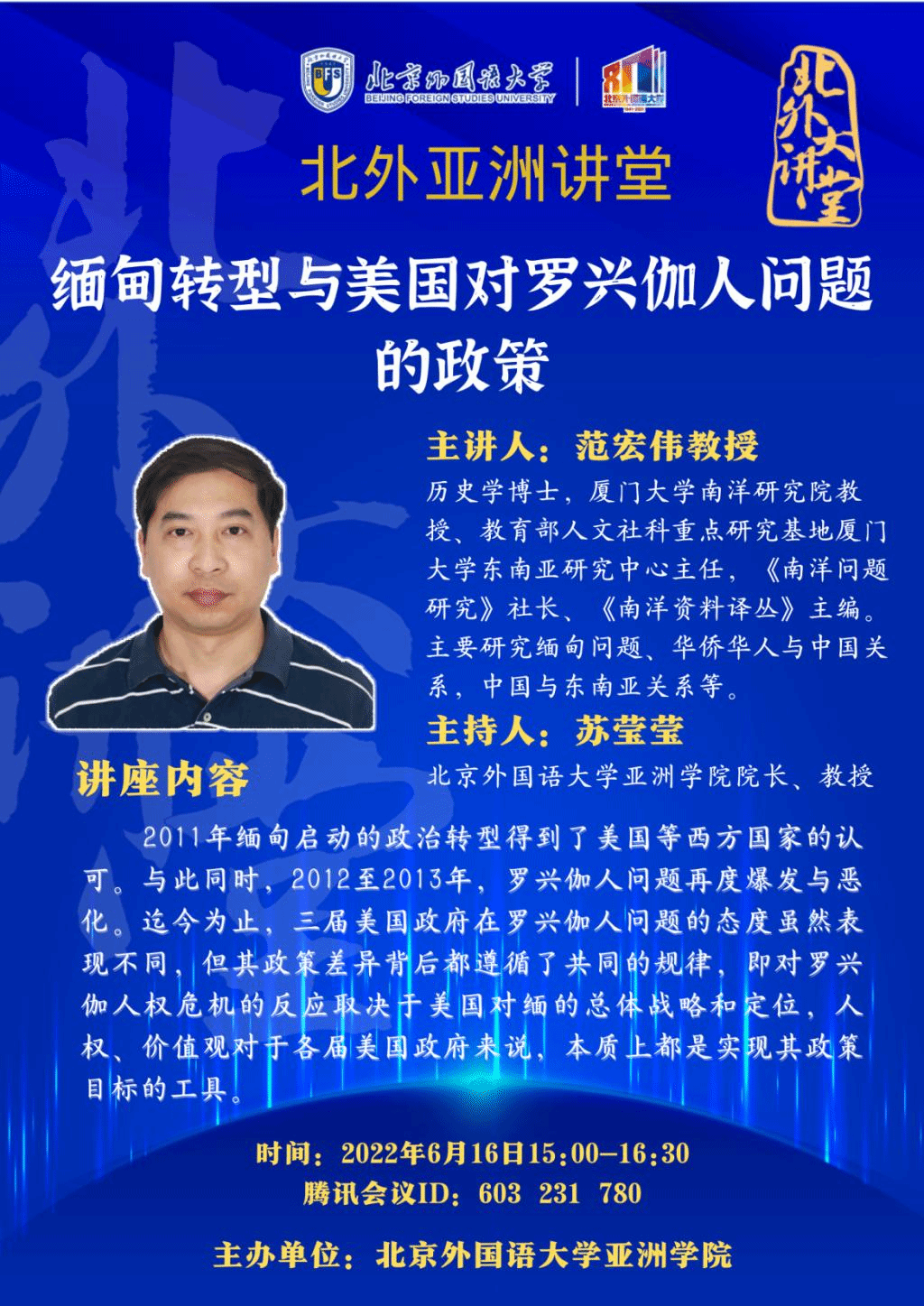 2022年6月16日下午,“北外亚洲讲堂”系列讲座“缅甸转型与美国对罗兴伽人问题的政策”线上开讲。本次讲座由厦门大学南洋研究院教授、《南洋问题研究》社长范宏伟教授主讲。新葡8883官网AMG官网院长苏莹莹教授主持。来自新葡8883官网AMG官网、厦门大学、云南大学等高校师生近100人参加了讲座。