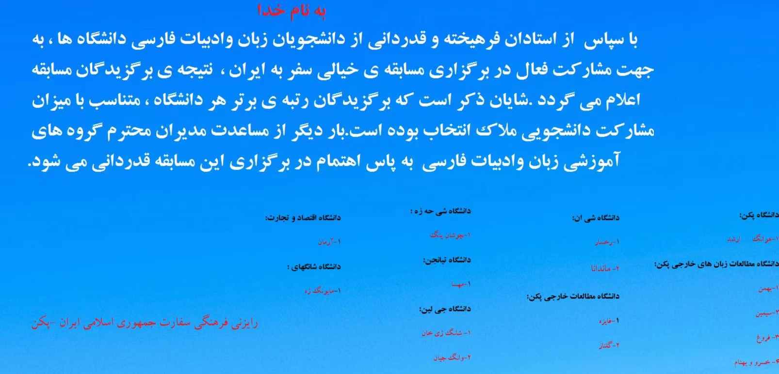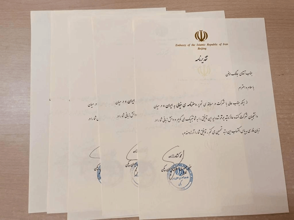 近日,由伊朗驻华大使馆主办的“伊朗游记”全国波斯语征文比赛结果公布,新葡8883官网波斯语专业张艺凡、倪潇然、马佳乐、姚远和王前等五位同学获奖。