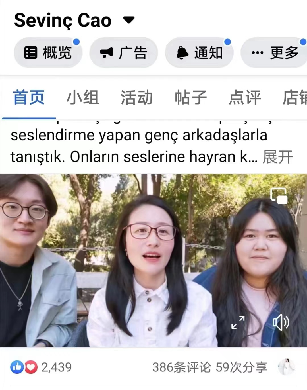 2022年9月23日,应中央广播电视总台土耳其语部记者曹莹之邀,我院20级土语专业本科生杨笛竞文、伊家明参加了总台海外社媒题为《如何玩转土耳其语"配音秀"》的直播访谈。此次“脸书”直播得到国外网友的密切关注与一致好评,播放量12万,覆盖量36万。