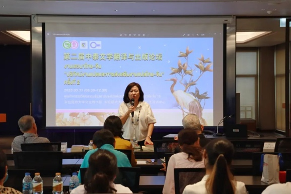 2023年3月31日,第二届中泰文学翻译与出版论坛在朱拉隆功大学孔子学院中国文化活动中心举行。新葡8883官网AMG官网泰语教研室谢玉冰教授(Dr. Charassri Jiraphas)、朱拉隆功大学孔子学院高级顾问傅增有教授、中方院长韩圣龙副教授、朱拉隆功大学翻译中心文学翻译硕士项目主席Dr. Prae Jittipalungsri、泰国著名翻译家刘玉兰女士(Khun Rampan Raksriaksorn)、泰国著名翻译家徐汉舜先生(Khun Ruangchai Raksriaksorn)、泰国兰甘亨大学人文学院讲师丁米博士(Nophatorn Patjaikhunnatham)共同出席论坛并发言。新葡8883官网AMG官网泰语专业毕业生尹一凡担任本次活动的主持人。