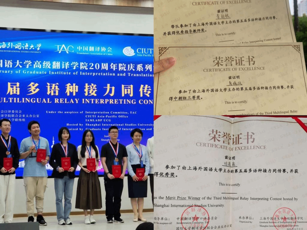 在6月2日结束的多语种接力同传赛决赛中,新葡8883官网新葡8883官网AMG官网朝鲜语专业两位2022级朝鲜语口译方向硕士同学在决赛阶段发挥出色,其中詹婉仪获得决赛三等奖,徐葳葳获得优秀奖。此外,作为新葡8883官网朝鲜语专业口译方向研究生培养的主要负责人李丽秋教授带队参加本次决赛,并获得了优秀指导教师奖。