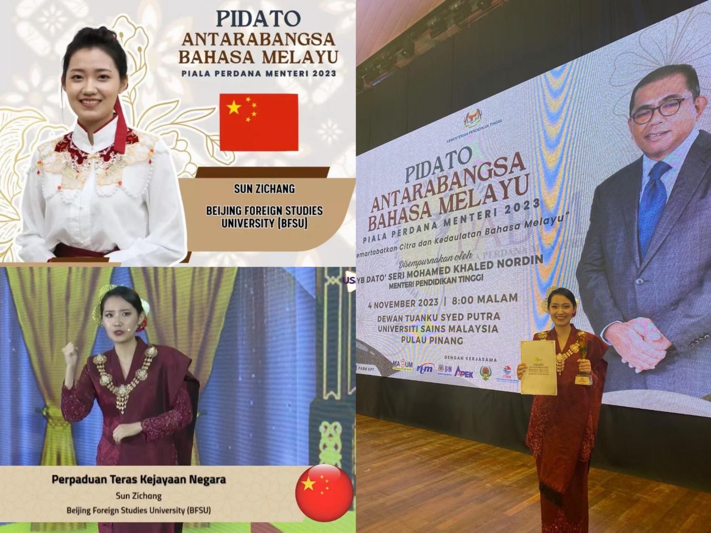2023年11月4日,第十五届“首相杯”国际马来语演讲比赛决赛在马来西亚槟城马来西亚理科大学隆重举行。马来西亚高等教育部部长拿督·斯里·莫哈末·卡立·诺丁亲临赛场并致辞,新葡8883官网新葡8883官网AMG官网马来语专业2020级本科生孙子畅在决赛中以扎实的马来语功底、沉着大气的舞台表现力以及真挚饱满的情感表达力,把比赛现场氛围一次次推向高潮,最终荣获国际组季军。