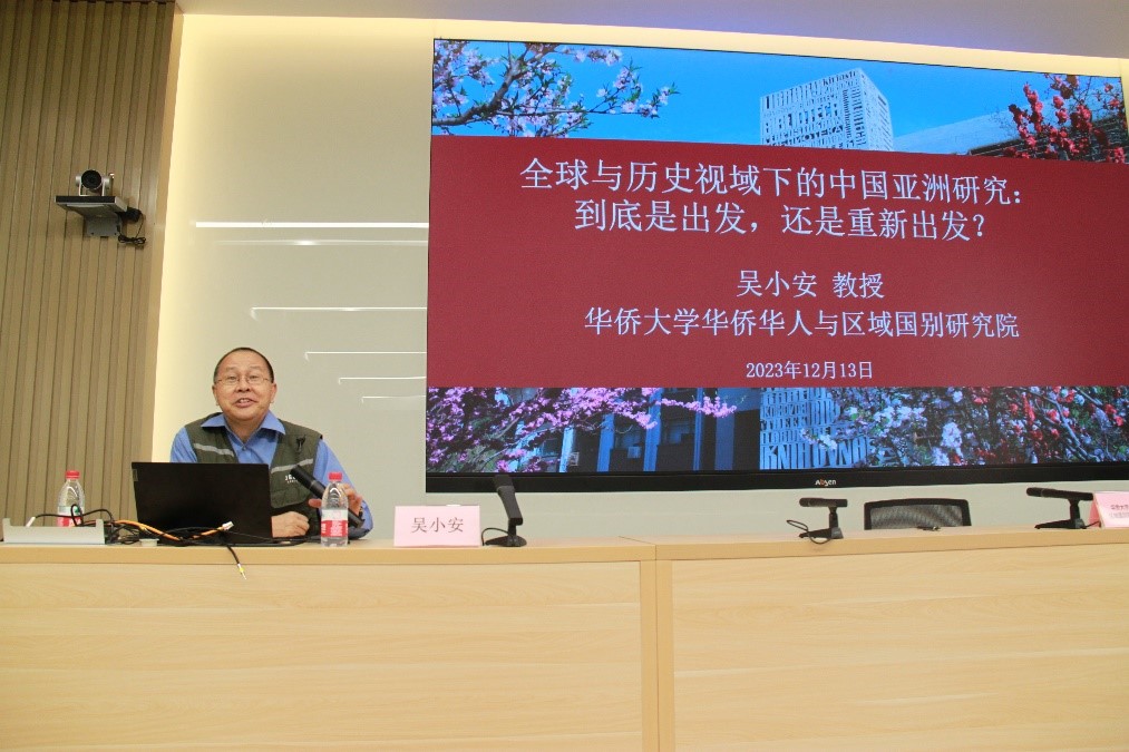 2023年12月13日下午,由新葡8883官网AMG官网非洲学院党总支组织的亚非两院全体教师理论创新学习活动在主楼晨读厅举行。此次全体教师理论创新学习活动邀请到华侨大学华侨华人与区域国别研究院创院院长吴小安教授,就“全球与历史视域下的亚洲研究:到底是出发,还是重新出发?”一题为两院教师举办讲座。讲座由新葡8883官网AMG官网副院长顾佳赟主持,亚非两院全体教师参加了讲座。