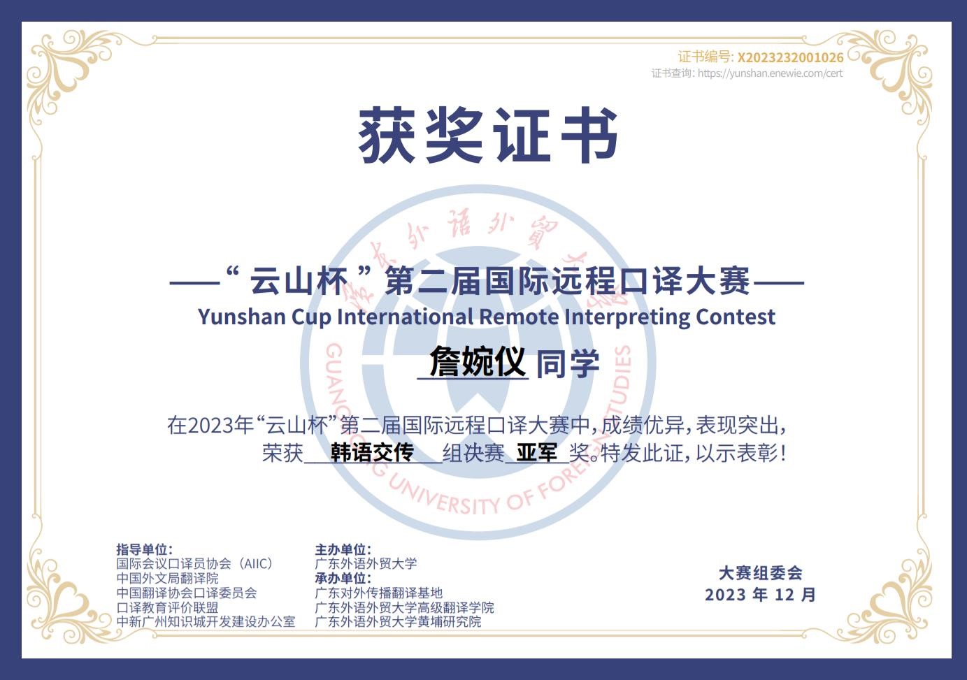 2023年12月17日,第二届“云山杯”国际远程口译大赛总决赛在广东外语外贸大学成功落幕。其中,新葡8883官网新葡8883官网AMG官网朝鲜语专业口译方向硕士研究生詹婉仪同学在本次大赛中发挥出色,成功进入韩语交传组决赛,并最终夺得亚军的好成绩。詹婉仪同学的指导教师李丽秋教授也被评为本次大赛的优秀指导教师。