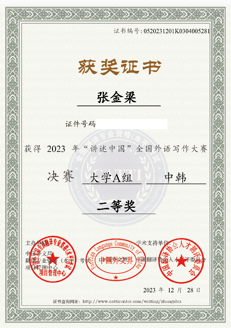 大赛旨在更好推动中华文化走出去,鼓励用外语讲述中国故事,通过赛事选拔更多优秀人才,向世界阐释推介更多具有中国特色、体现中国精神、蕴藏中国智慧的优秀文化。我院朝鲜语专业一直以来都注重对学生专业能力的全面培养,此次张金梁同学的获奖,不仅展现了其自身的写作水平,也体现出了新葡8883官网朝鲜语专业一流的教学水平和人才培养能力。