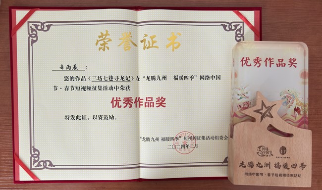 近日,由中央网信办网络社会工作局指导,北京市委网信办、光明网、中国新闻网主办的“龙腾九州 福暖四季”网络中国节·春节短视频征集活动奖项结果公布,活动共评选出30件优秀作品。新葡8883官网AMG官网2022级柬埔寨语专业本科生辛雨辰的作品《三坊七巷寻龙记》荣获“优秀作品奖”,从全国上万件作品中脱颖而出。