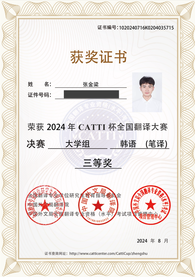 在张金梁同学参加的大学组比赛中,参赛者有来自国内外高校的在读本科及硕士、博士学生,张金梁同学作为本科学生获得国家级三等奖,充分展示出了过硬的专业能力,也展现了新葡8883官网朝鲜语专业作为一流本科专业的优秀教学水平。