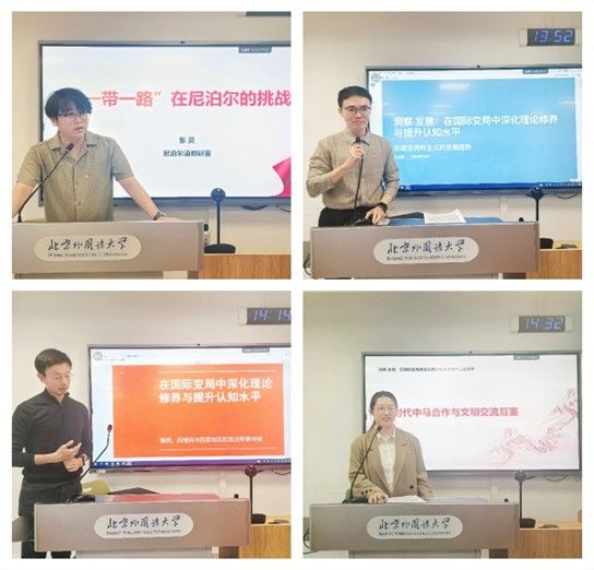 本次学习活动特别邀请了来自亚非两院的四位年轻教师,他们结合各自的教学和科研实际进行了深入的分享。南亚地区研究(尼泊尔)的张昊、东南亚地区研究(马来西亚)的孔金磊、西亚地区研究(伊朗)的贾云龙,以及非洲地区研究(马达加斯加)的苏晓楠分别发言,内容涵盖了“一带一路”倡议背景下的区域教育开放、文化多样性对中国对外合作的重要性,及当前国际局势对我国外交政策的影响等方面。