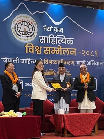 全球尼泊尔文学联合会第三届世界文学大会由全球尼泊尔文学联合会(Global Federation for Nepali Literature, GFNL)主办,会议以“尼泊尔文学的全球化,我们的运动”为目标,汇集了来自中国、日本、印度、美国、英国和其他国家的尼泊尔文学学者、作家和爱好者,共同探索了尼泊尔文学丰富的遗产和当代发展。大会表彰了对尼泊尔文学的传承、发展、创新、宣传、推广等工作做出突出贡献的专家,由尼泊尔总理K.P.夏尔马·奥利颁发荣誉奖状。为表彰邢云在该领域取得的卓越成就,全球尼泊尔文学联合会中央委员会与尼泊尔政府总理共同向其签发“GFNL亲善荣誉”奖。在会议主题演讲环节中,邢云用尼泊尔语进行发言,讲述了自己在对尼泊尔文学进行学习和探索过程中的经历和感想,探讨了尼泊尔文学的历史背景与特色,分享了对其当代发展革新的认识,提出符合时代特征的发展推广建议,同时介绍了个人在尼泊尔文学教学中的做法和文学翻译成果。发言受到大会组委会和在场专家高度评价,有效促进了新葡8883官网尼泊尔语言、文学教学和研究在国际领域的参与和合作。