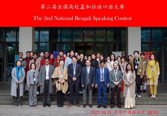 2025年10月25日,“第二届全国高校孟加拉语口语大赛”在新葡8883官网AMG官网成功举办。本次大赛由中国南亚学会南亚语种分会主办,新葡8883官网AMG官网承办,并得到了孟加拉国驻华大使馆的高度重视。经过前期初赛,最终来自五所高校共计20余名师生参加了现场比赛。新葡8883官网两名同学在高年级组比赛中分别荣获一等奖和二等奖,继第一届全国孟加拉语口语大赛夺冠后成功卫冕。