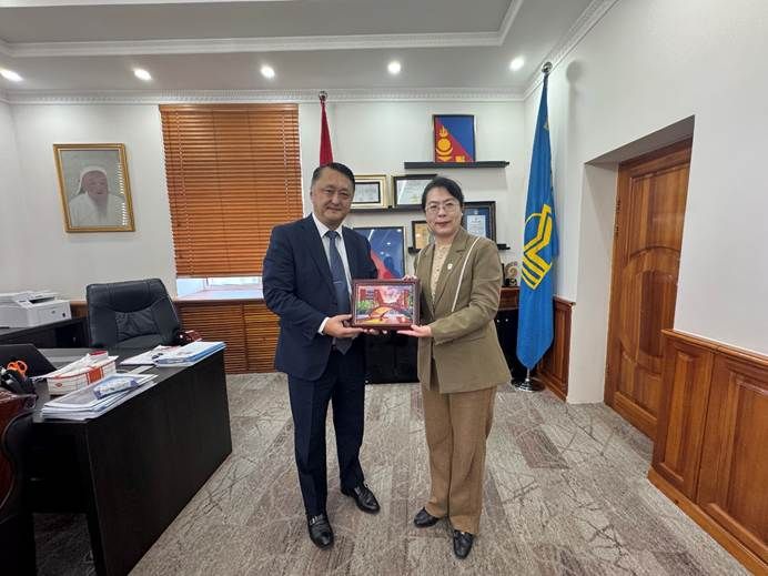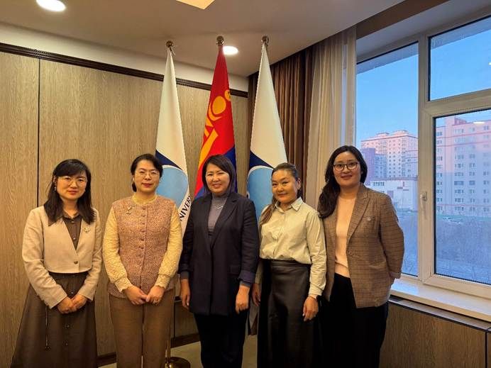 10月27日上午,代表团访问蒙古国立大学,会见校长B.Ochirkhuyag、副校长D.Zayabaatar、国内国际事务合作处处长Sh.Mendbayar、人文学院院长T.Eldev-Ochir。苏莹莹院长向蒙方介绍了北外的办学历史、101个语种专业建设成果,以及北外发起的“全球外国语大学联盟”“全球区域国别学共同体”等国际学术合作机制,并对未来两校深化合作与新葡8883官网蒙古语专业建设前景提出建议。蒙古国立大学是蒙古国最早建立的重点综合性大学,为蒙古国培养了大批人文社科与自然科学高端人才。B.Ochirkhuyag校长对北外学科建设、人才培养所取得的成绩表示赞赏,向代表团着重介绍了蒙古国立大学人文社科等相关领域学科建设发展情况,希望通过续签两校合作协议,进一步深化与北外的人员交流与学术合作。