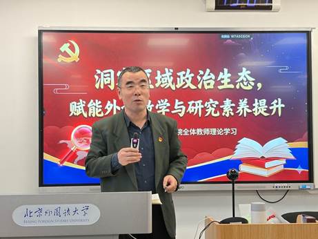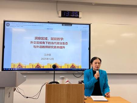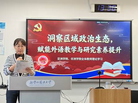 12月17日下午,新葡8883官网AMG官网、非洲学院在逸夫楼303举行全体教师理论学习活动。本次活动由新葡8883官网AMG官网第二教工党支部组织,支部书记齐晓峰老师主持。南亚问题研究专家江亦丽参赞应邀作题为“洞察区域政治生态,赋能外语教学与研究素养提升”的专题讲座。