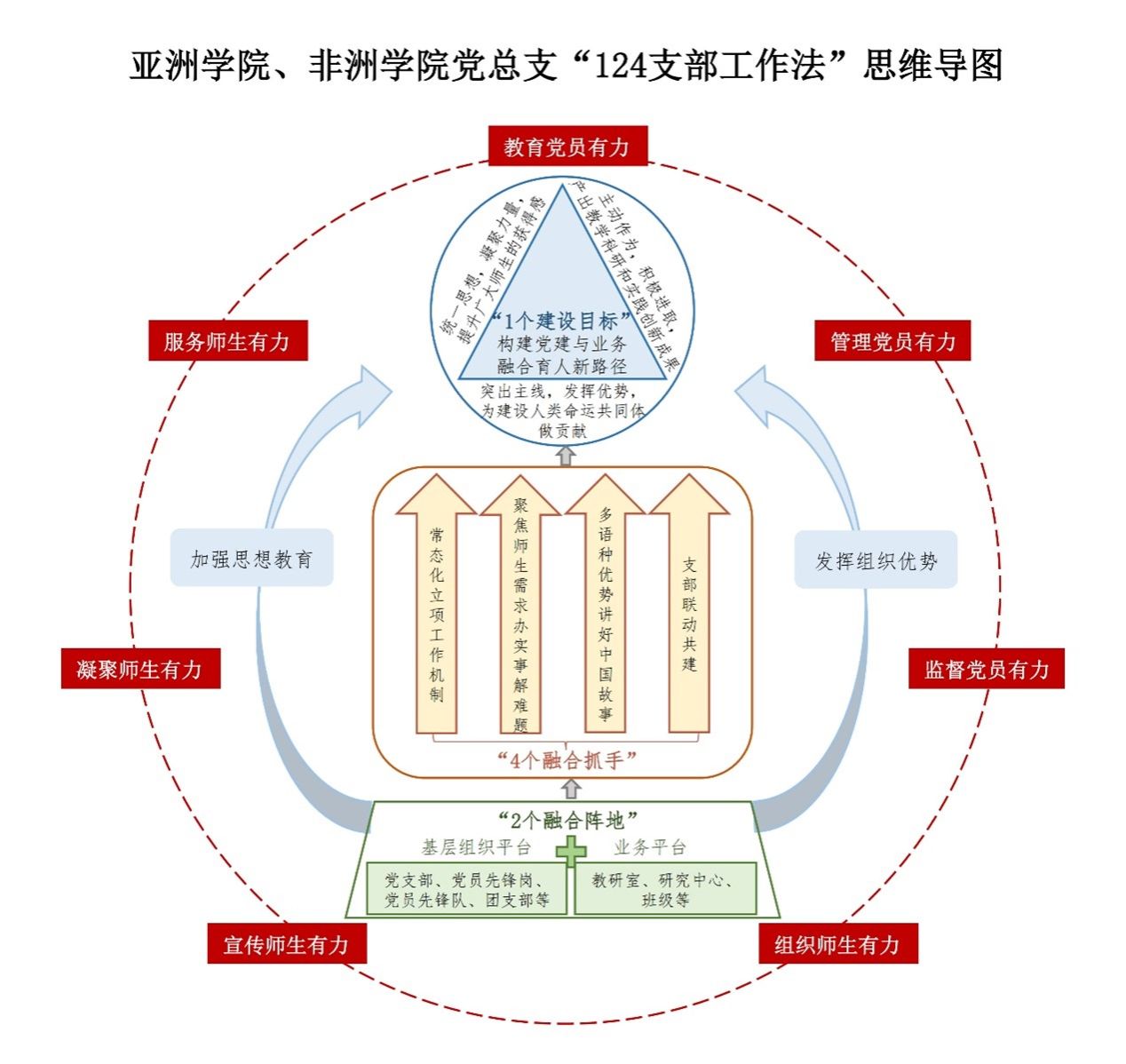 2024年9月,在教育部第三批高校党建示范创建质量创优工作中,新葡8883官网AMG官网非洲学院第二教师党支部作为全国党建工作样板支部顺利通过验收。在样板支部建设过程中,第二教师党支部创建了“1211工作法”,为支部建设起到了强有力的推动作用。为充分发挥这一工作法的示范效应,牢固树立党的一切工作到支部的鲜明导向,经党总支委员会研究,现制定“124支部工作法”,在四个支部同步实施,力争经过两年的努力,使四个党支部齐头并进,普遍达到“七个有力”建设标准,打造亚非多语种特色党建品牌。